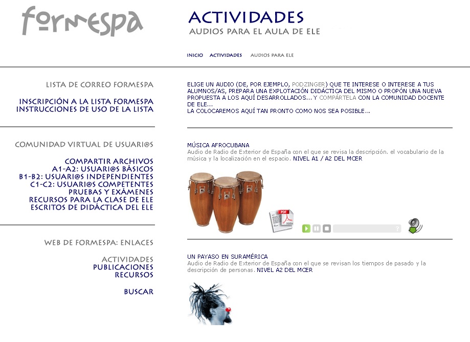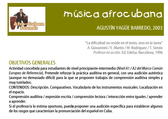 - Formaespa, blog de español donde puedes encontrar multitud de audios con sus respectivas actividades y para todos los niveles. https://formespa.rediris.es/audios/ Es una herramienta muy buena, ya que se tiene muy encuenta aspectos culturales así como variedades dialectales. En el ejemplo que ponemos, se trabaja con pecualiaridades del español hablado en Cuba. Se corresponde con un A1/A2 y se trabaja con material real, a la vez que sencillo para estos alumnos. https://formespa.rediris.es/audios/pdfs/musicaafrocubana.pdf