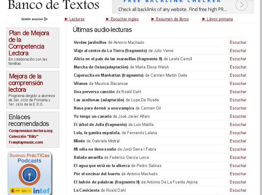 - Si tanto tus alumnos como tú, el docente, están interesados en trabajar con textos, narraciones, cuentos, etc., con esta herramienta podrás llevarlo a tus clases. Cuenta con audiolecturas mediante las que puedes combinar multiples destrezas y, además, desarrollar distintas actividades para reforzar la comprensión auditiva de estos textos. Hay diversidad de tipologias textuales así como de autores. https://recursosdidacticos.es/textos/listado_audiolecturas.php