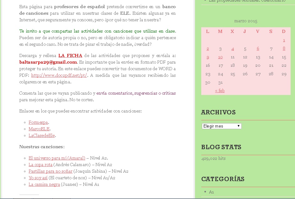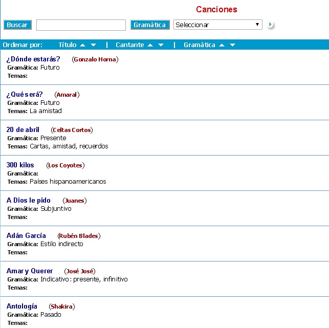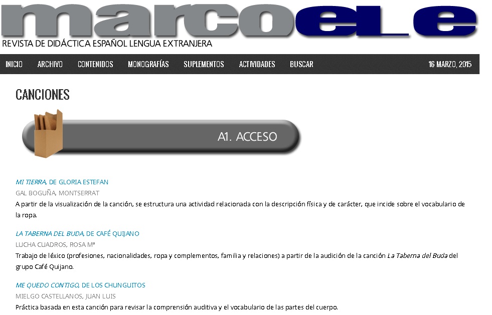 - https://www.todoele.net/canciones/Cancion_list.asp --> Blog Todoele donde puedes buscar material a partir de los contenidos gramaticales que quieras trabajar, incluso para trabajar la geografía y cultura de los países hispanohablantes.