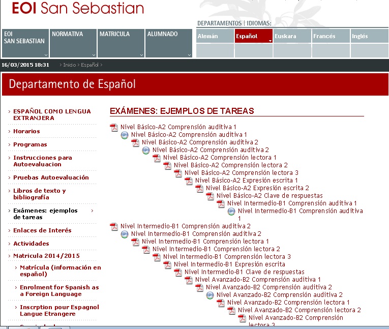 - En la página web de la Escuela Oficial de Idiomas de San Sebastián se ofrecen los exámenes de certificación de español como lengua extranjera, al igual que sus respectivos audios. Además, se incluyen otros ejemplos de exámenes de las restantes destrezas y de todos los niveles que ofrecen en esta EOI. https://eoidonheo.org/es/departamento.php?Departamento=Espa%C3%B1ol&Id_Departamento=1&Id_Seccion=559 Es ideal para reforzar esta destreza, hay mucho material. Además, en los niveles superiores se combinan variedades lingüísticas (ejemplo: nivel C1, combinación con hablante Argentino).